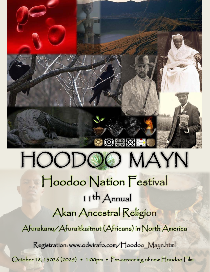 HOODOO is the Akan (ah-kahn') term Ndu (oohn-dooh') meaning 'medicine' from roots, trees, plant life. The Akan term Ndu also means to become 'heavy' with the spirit through spirit-possession and spirit-communication. Hoodoo is Akan Ancestral Religion preserved in the blood-circles of our Akan Ancestresses and Ancestors who were forced from the regions of contemporary Ghana and Ivory Coast, West Afuraka/Afuraitkait (Africa) into North America during the Mmusuo Kese (Great Perversity/Enslavement era). We have preserved and passed down our Akan Ancestral Religious traditions as Hoodoo for over three centuries in North America. This cultural and religious transmission is intergenerational and transcarnational - passed down through successive reincarnations (bebra) within our Akan matriclans and patriclans.