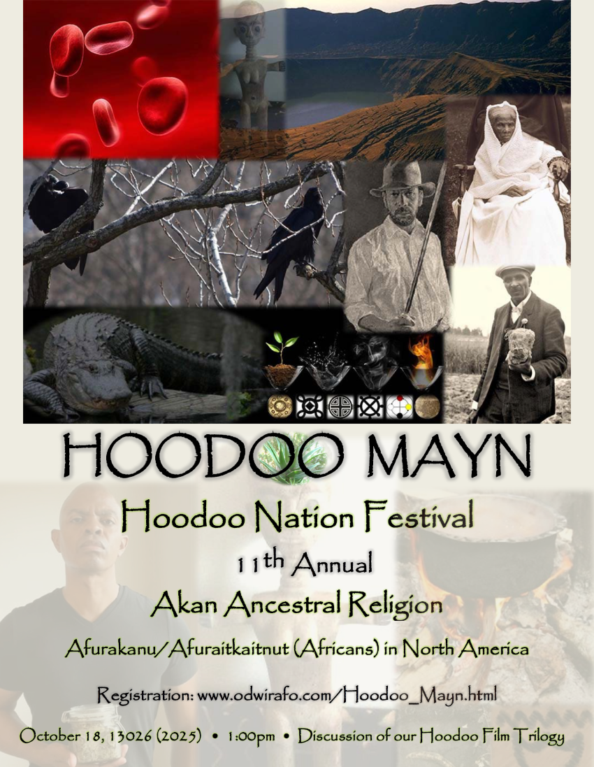 HOODOO is the Akan (ah-kahn') term Ndu (oohn-dooh') meaning 'medicine' from roots, trees, plant life. The Akan term Ndu also means to become 'heavy' with the spirit through spirit-possession and spirit-communication. Hoodoo is Akan Ancestral Religion preserved in the blood-circles of our Akan Ancestresses and Ancestors who were forced from the regions of contemporary Ghana and Ivory Coast, West Afuraka/Afuraitkait (Africa) into North America during the Mmusuo Kese (Great Perversity/Enslavement era). We have preserved and passed down our Akan Ancestral Religious traditions as Hoodoo for over three centuries in North America. This cultural and religious transmission is intergenerational and transcarnational - passed down through successive reincarnations (bebra) within our Akan matriclans and patriclans.